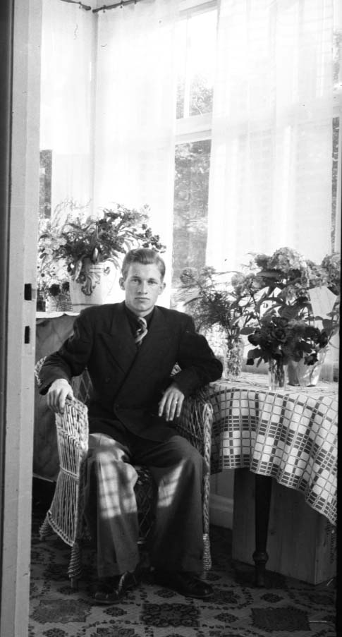 Porträtt av en ung man som sitter i en korgstol på en glasveranda omgiven av blomster. Troligen firas hans födelsedag. Möjligen fotografen själv. Troligen samma bostad som bildnr E8219-E8220.