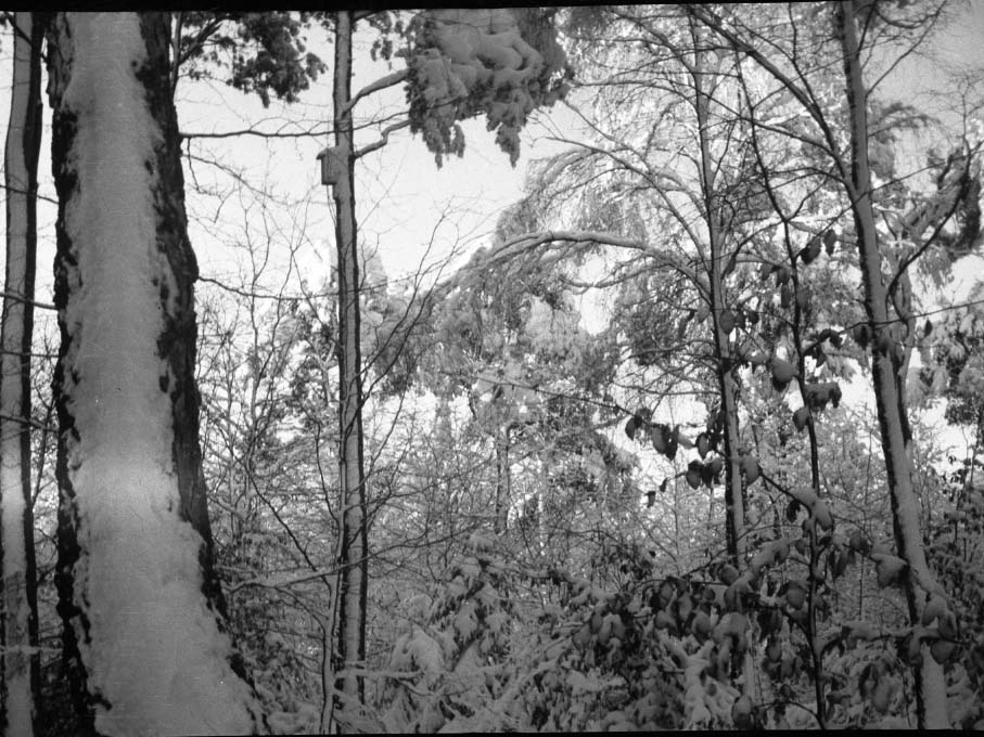 "Vinterbild/Ringvägen". Skog eller park med snö på träden.