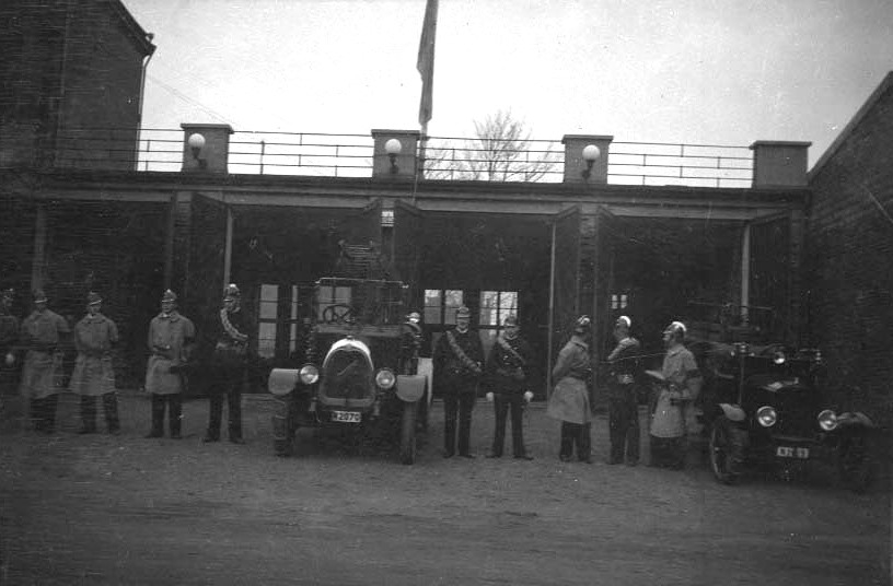 Brandstationen i Varberg på Engelbrektsgatan 5. Kv Komedianten. Bild 1 är spegelvänd så Teatern ligger på "fel" sida. Manskap och fordon uppställda framför stationen. Troligen avser noteringen "Branden på söder" i negativblocket denna bild. Flaggan är på halv stång, manskapet bär sorgbindlar på ärmarna och till höger framför dem syns ett blomsterarrangemang. Troligen hedras en omkommen kollega.