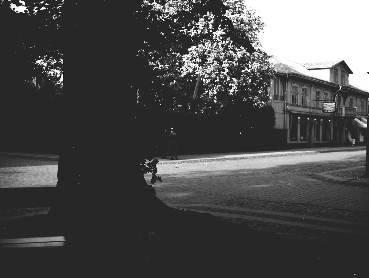 Stadsvy från kyrkotomten längs Kyrkogatan mot huset där butiken "Färgarns" låg. Till höger går Drottninggatan in.