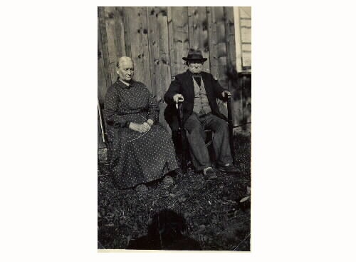 Johanna och Bengt i Syrhult. Det gamla paret sitter invid en omålad stugvägg.