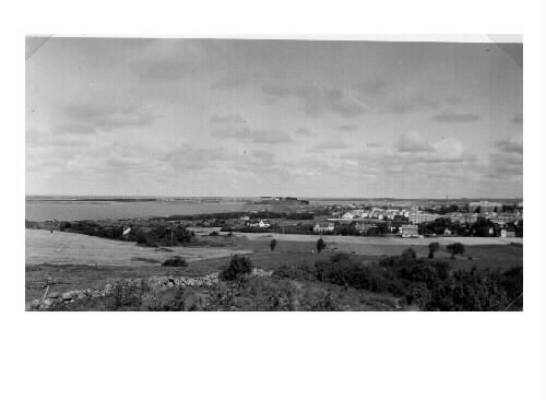 Varberg sett från Hästhagabergen. Vy över kustlinjen, Södra stadsdelarna och fästningen.
