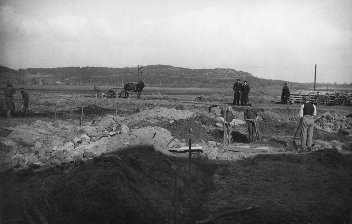 Utgrävning av Ny Varberg vid Lindhovs kungsgård. Anteckning på baksidan: "Platsen för staden Nyby eller Gettakärr. Tillhör Eric Johansson, Box 36, Varberg."
