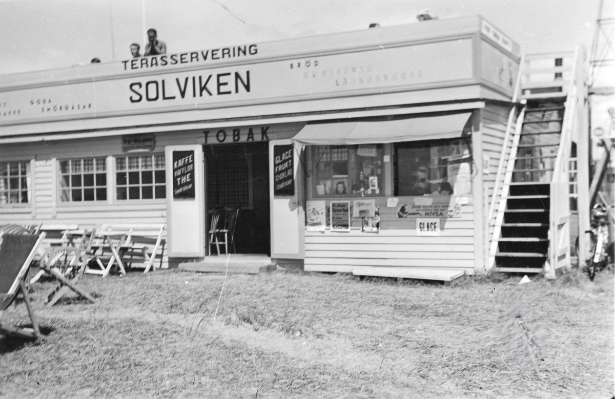 Restaurang Solviken, Stora Apelvik, som innehades av Eric Johansson 1945-1960. Bild 5 föreställer Eric Johansson med sonen Bengt Bossmark utanför restaurangens ingång. Solviken hade terassservering, en kioskdel och en restaurangdel. På takgesimsen utlovades "Extra gott kaffe" och "Goda smörgåsar". I utbudet fanns även våfflor, the, glace (glass), frukt, choklad, konserver och läskdrycker.