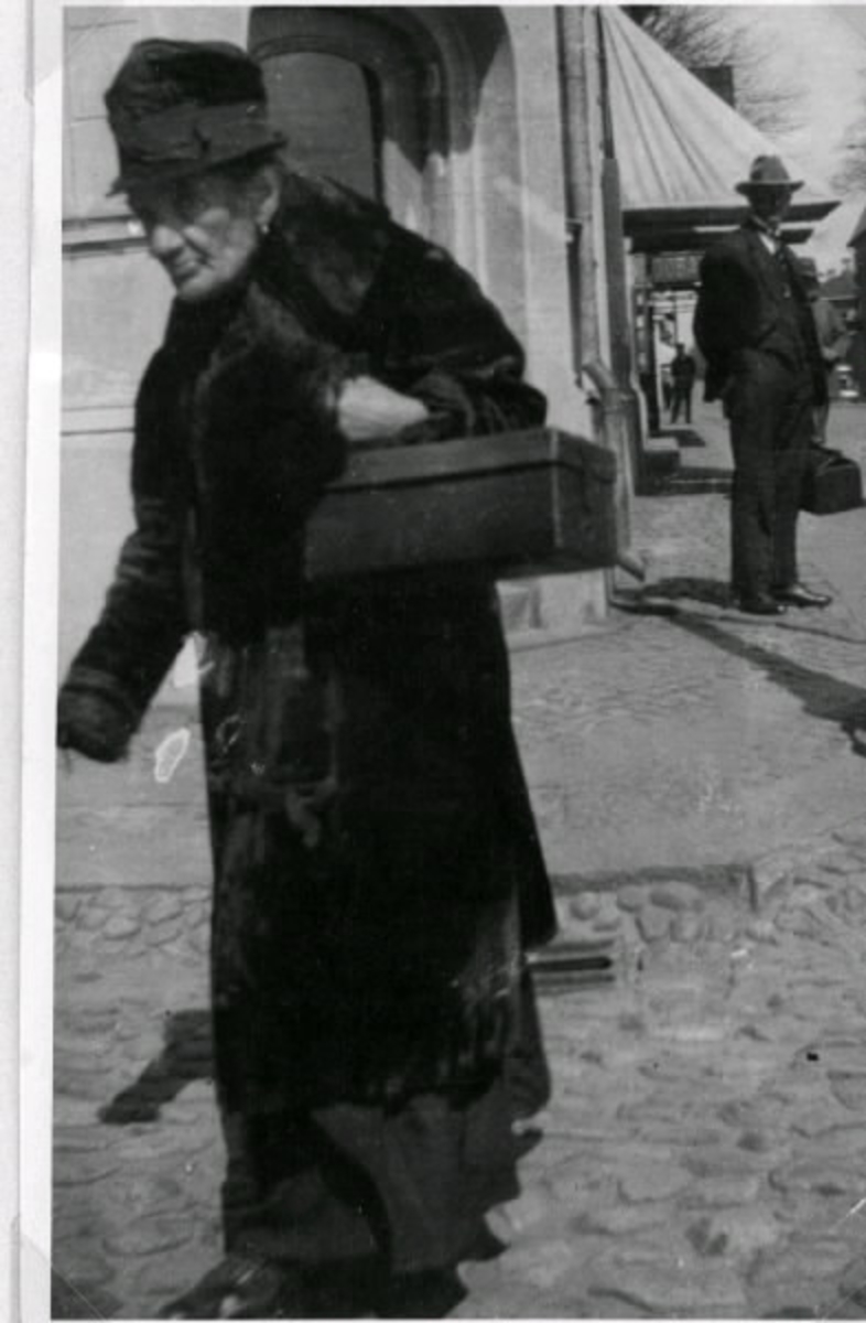 Lärarinnan Olivia Steinort, Istorp, Torestorp, kallad "Visselgumman". Smeknamnet fick hon för att hon inte tyckte om när barnen visslade. Vid sydvästra torghörnet i bakgrunden hörnhuset i kv Gästgivaren 15 som ännu finns kvar (2003).