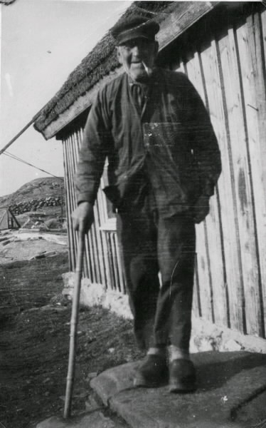 "Originalet 'Jabba' från Biskopshage, Värö socken." Han står på stugtrappan med käpp och pipa. I bakgrunden en bergknalle.