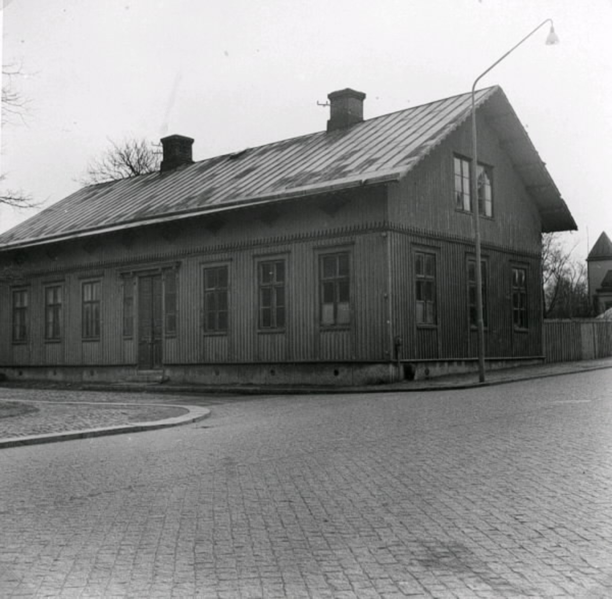 Exteriör. Hus på fastigheten kv Kronofogden 4 i hörnet Södergatan-Västra Vallgatan. Tid: Troligen 1940-tal.