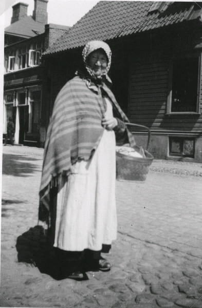 En äldre kvinna, "Brö-Mormor"(?), står med korg på armen, klädd i huckle och stor sjal över klänningen, vid torgets nordöstra hörn framför fastigheten kv Apotekaren 8.