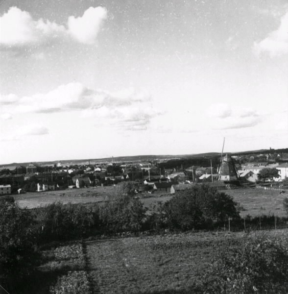 "Vy över Varberg tagen från Hästhagabergen. Vattentornet (ca 1897-1954) skymtar vid horisonten och 'Börjessonska' kvarnen å kv Ryttaren 16, som ännu står där (2003)."