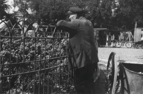Okänd man står och lutar sig mot Brännvinsringen på torget. Sopkärran bredvid honom tillhör en renhållningsman som jobbar intill honom (se vildnr F4740). En annan bild från samma tillfälle finns på bildnr F3022 bild 3, där båda männen är med. Brännvinsringen flyttades från torget 1937 och uppfördes i grönområdet Esplanaden.
