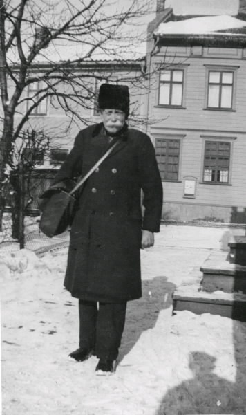 "Tidnings-Hedelius" vid ingången till Fastens Cafe på gården i kv Prosten 8. I fonden nuvarande "Gästis", kv Professorn 7, vid Borgmästaregatan. Troligen 1940-tal.