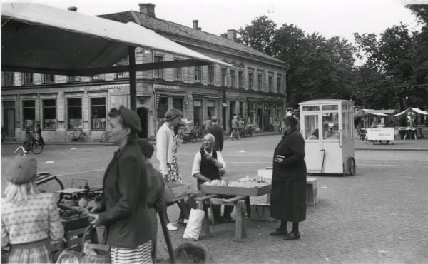 Torghandel på Varbergs torg med vy mot Lundquistska huset i kv Brunnsparken. På hörnan ligger Järnaffär Carl Nilsson & Son. Närmast ett par grönsakshandlare som bl a saluför blomkål. I kioskerna längre bort säljs glass; den bortre för Trollhätteglass.