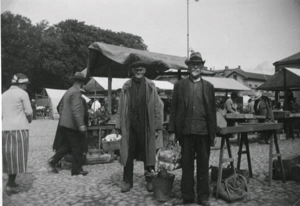 Varbergs torg med torghandel före 1937. Två män står vända mot fotografen och håller i korgar och en hink står mellan dem.
