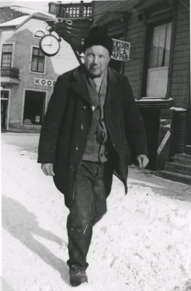 "Balla-Kalle" går i snön utanför den s k Millbergska fastigheten, kv Hantverkaren 1, med Norrmans Uraffär på hörnan. I bakgrunden syns Kooperativa, kv Nålmakaren. Någon gång på 1930- eller 1940-talet.