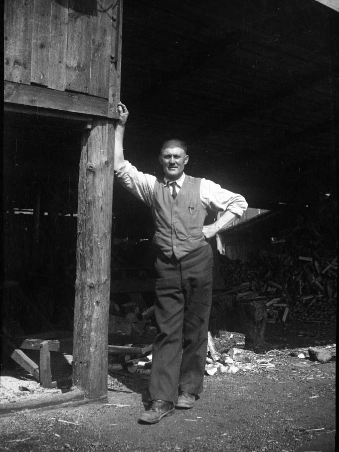 Porträtt av en man klädd i skjorta och väst. Mannen står lutad mot en stolpe vid ett vedskjul. Troligen "Thoresson i vedgården", enligt notering i negativblocket.