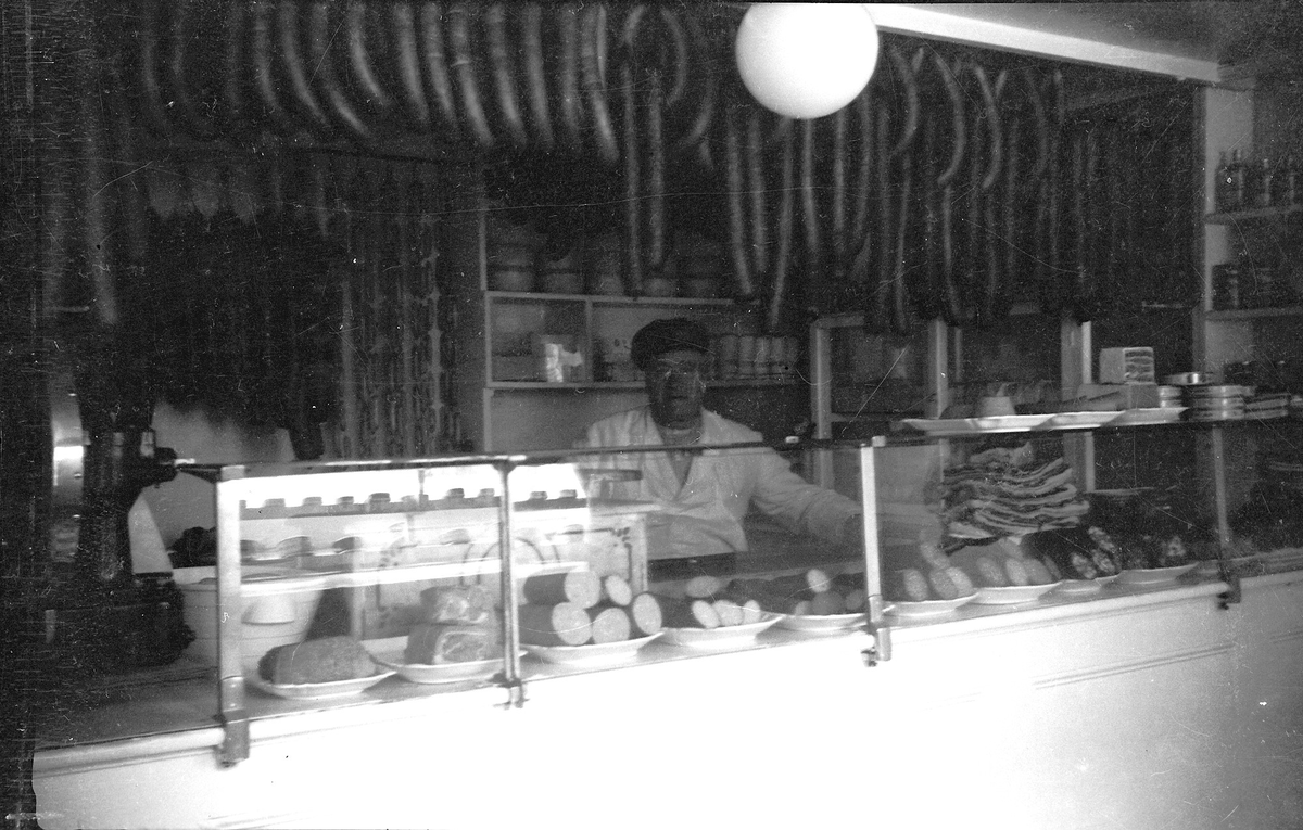 Interiör från en oidentifierad charkuteributik med hela korvar hängande i taket. Fläsk och charkvaror ligger i disken och till vänster står en kvarn. Bakom disken står charkuteristen i vit överdragsrock. Möjligen avser anteckningen "Johan Anders[son?] slakteriet" denna bild.
