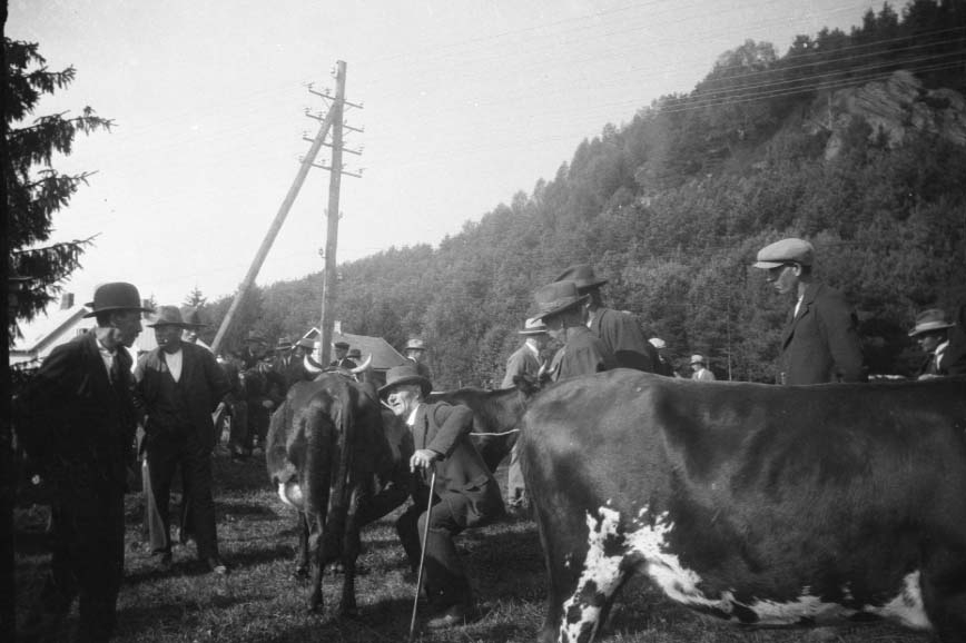 Möjligen kreatursmarknad eller besiktning av nötboskap. Några män tittar på en hjord kor. Kanske avser anteckningen i negativblocket "Marknad Ullared" denna bild.