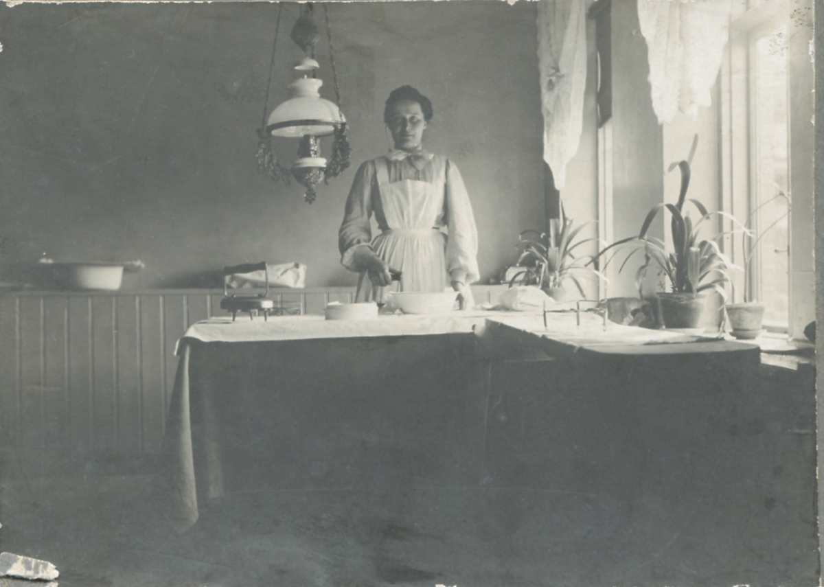 En okänd kvinna står vid ett bord i ett rum och häller ett medel i en liten balja, troligtvis i Kvarnbyn, okänt årtal. Givarens halvsyster Vendela Karlsson (från Tollered) hade en strykinrättning i Kvarnbyn. Troligtvis ej Vendela på bilden.