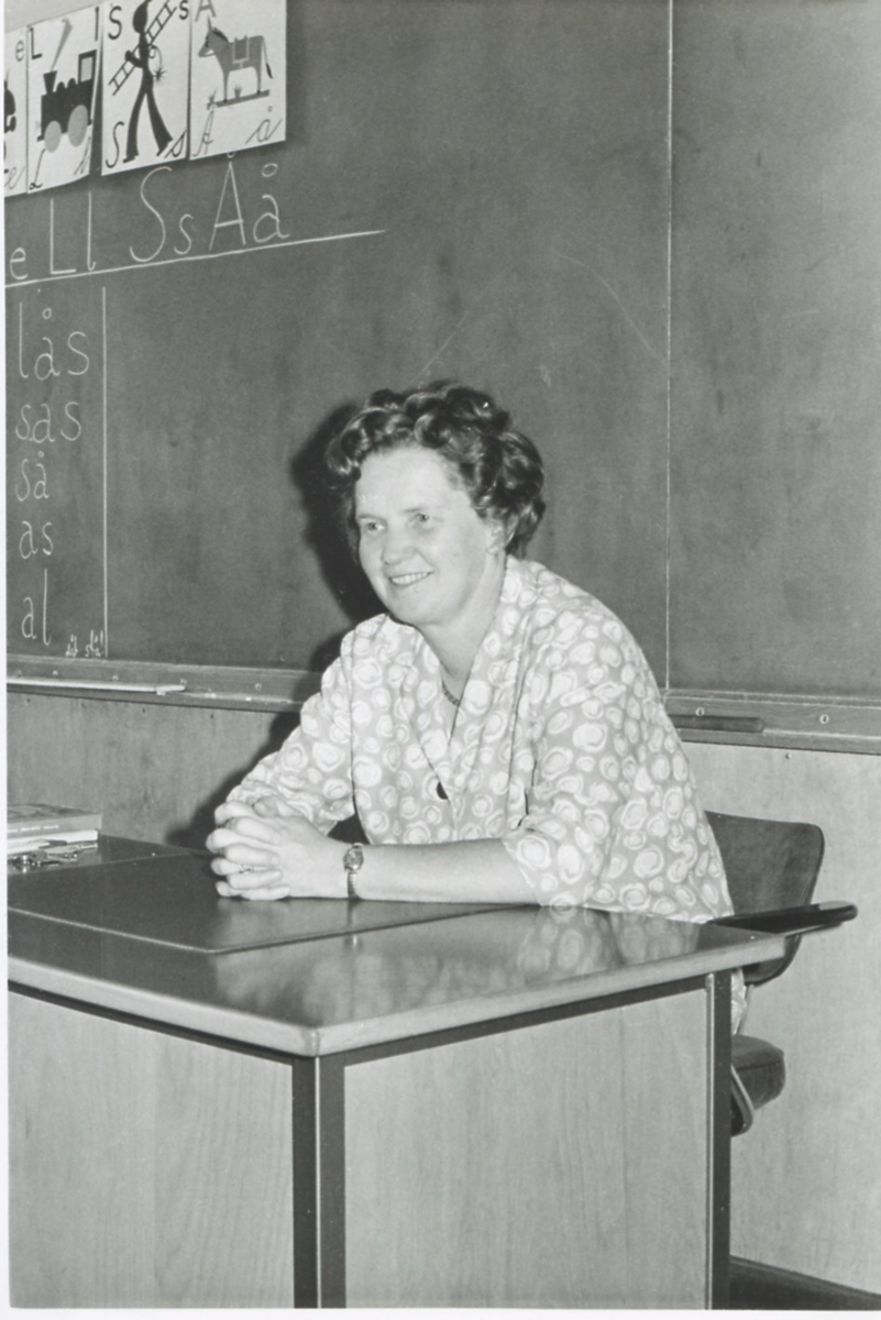 Småskolläraren Margit Wallin sitter vid en kateder framför "svarta tavlan", Brattåsskolan 1970-tal
