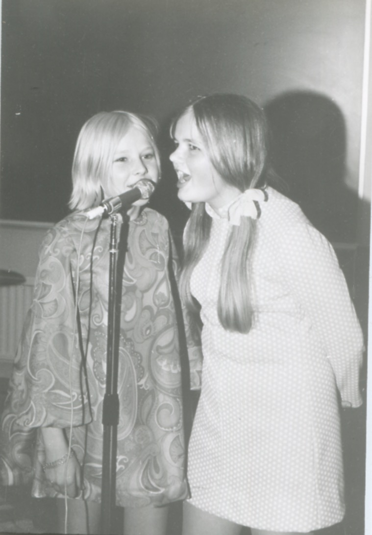 Två kvinnliga elever (födda 1955) från Brattåsskolan, sjunger i en mikrofon då de är på lägerskola till Ransbergs Herrgård i Värmland cirka 1965-67.