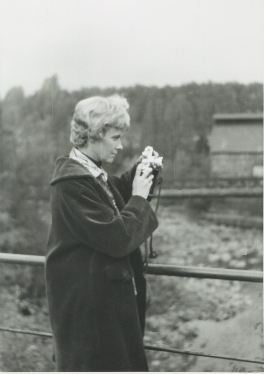 En kvinnlig lärarinna står utomhus, redo att fotografera. Elever från Brattåsskolan åk 6 är på lägerskola till Ransbergs Herrgård i Värmland 1960-tal.