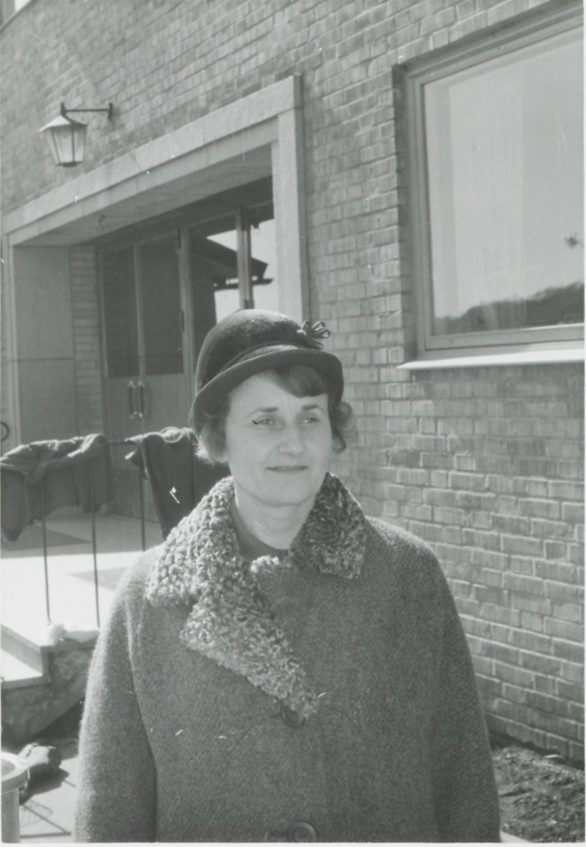 Småskollärarinna Sonja Andersson, iklädd hatt och kappa, står utanför Kålleredsskolans entré (senare Brattåsskolan) 1970-tal.
