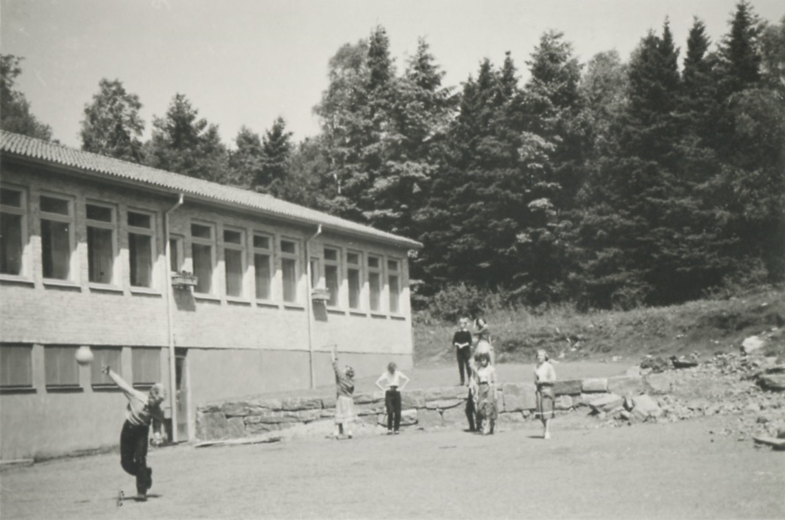Några elever befinner sig utanför Kålleredskolan (senare Brattåsskolan) på Streteredsvägen 9, 1960-tal.