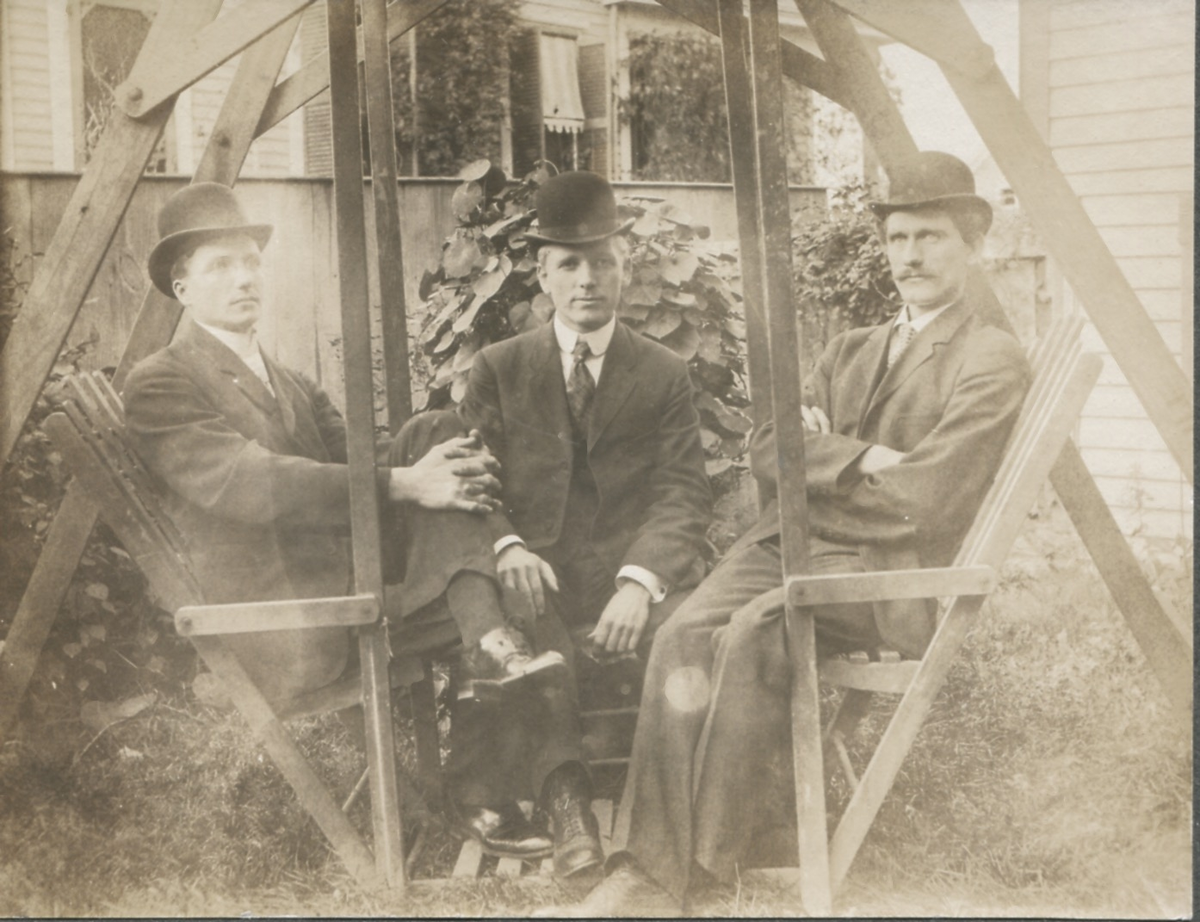 Carl Nelson (till vänster) sitter i en hammock tillsammans med två vänner utanför ett hus i USA cirka 1920. Carl Nelson, född i Västergötland, var gift med Alma Eriksson (född 1881 i Kållered). Paret fick sonen Robert tillsammans. Makarna höll tät kontakt med släkten i Sverige.