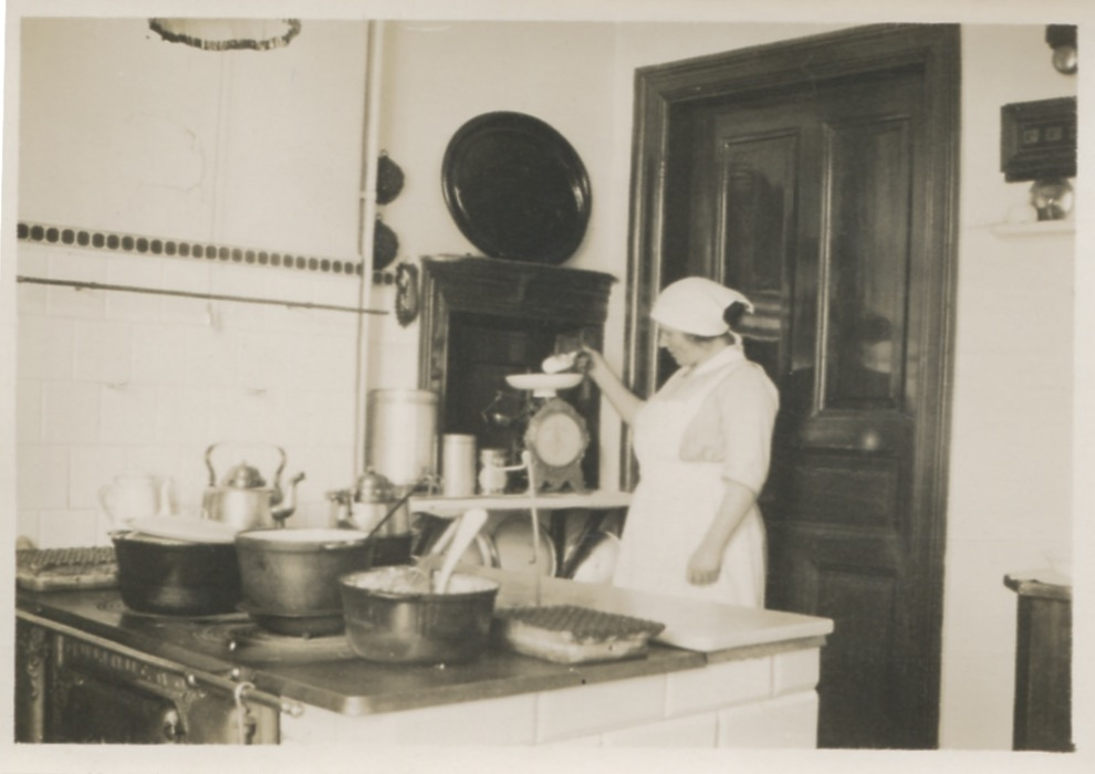 Kokerskan Hilma Olsson (bördig från Skåne) bakar i köket, Stretereds vårdhem okänt årtal. Hennes son, Åke Olsson, var fosterbarn i Vommedal Östergård "Petters".