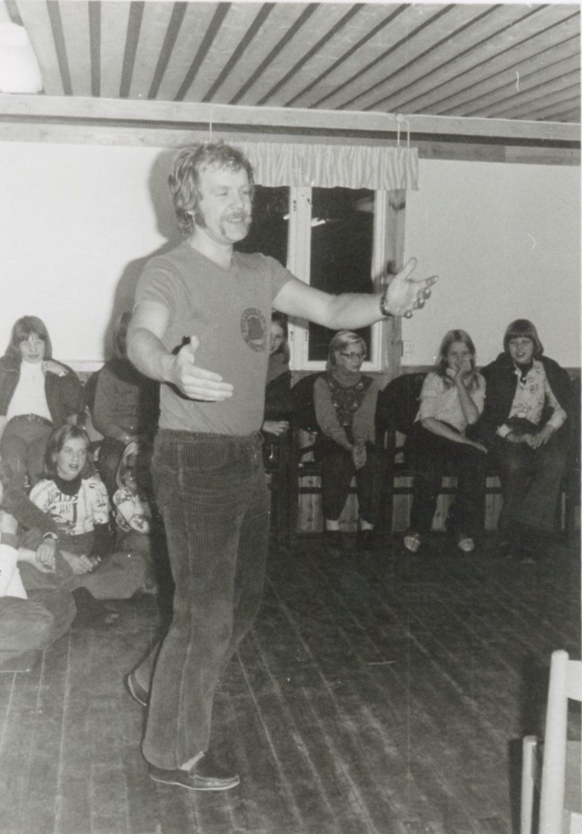 Lägerskola för Brattåsskolans elever åk 6, Ransbergs Herrgård i Värmland 1975. Läraren Tomas Bergström står på golvet framför några elever.