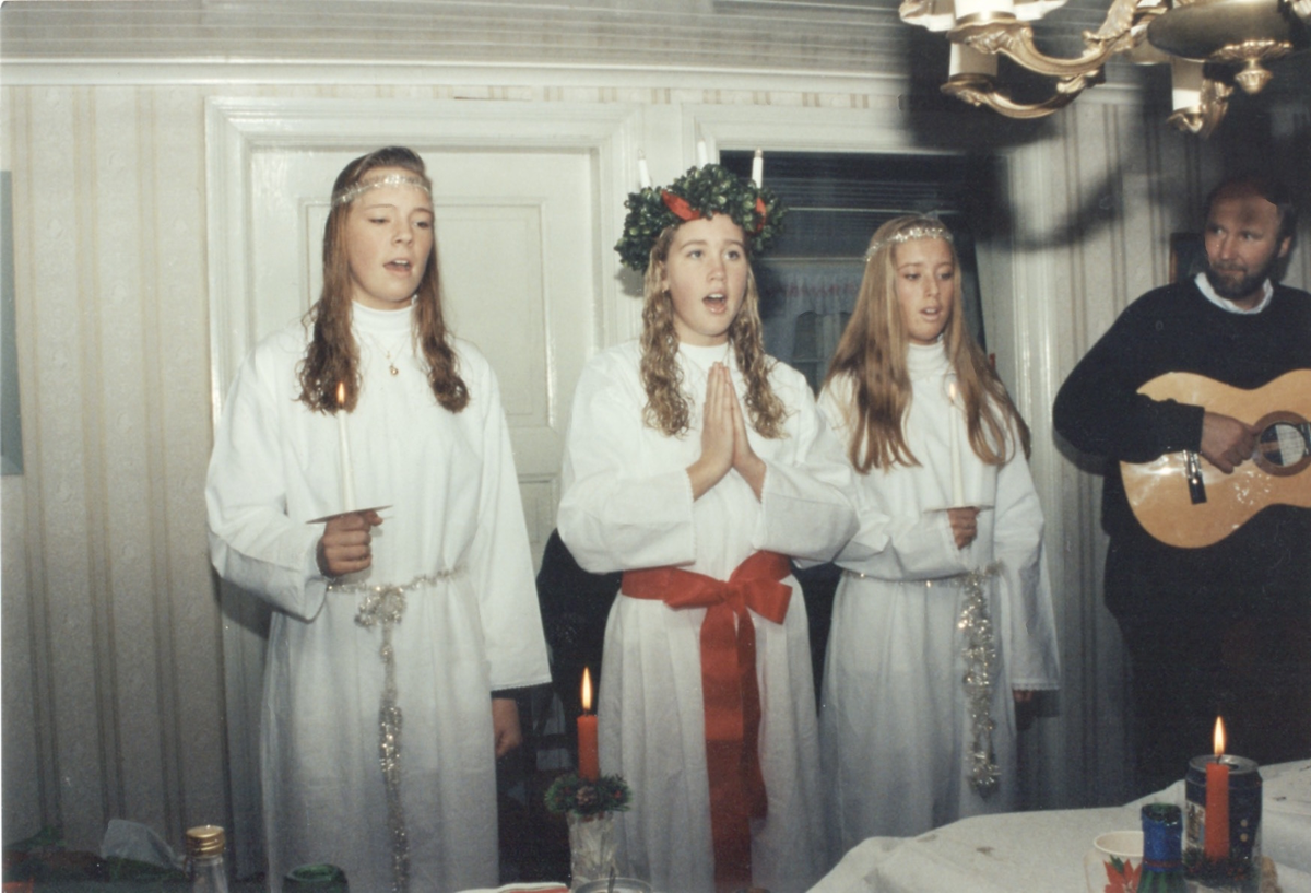 Lions Luciafirande i Vommedal Västergård "Hanses", okänt årtal. Från vänster: 1. Okänd tärna. 2. Lucia: Monika Andersson (Sven Anderssons dotter). 3 Okänd tärna. 4. Sven Andersson från Visans Vänner (gitarr). Relaterat motiv: A4525.