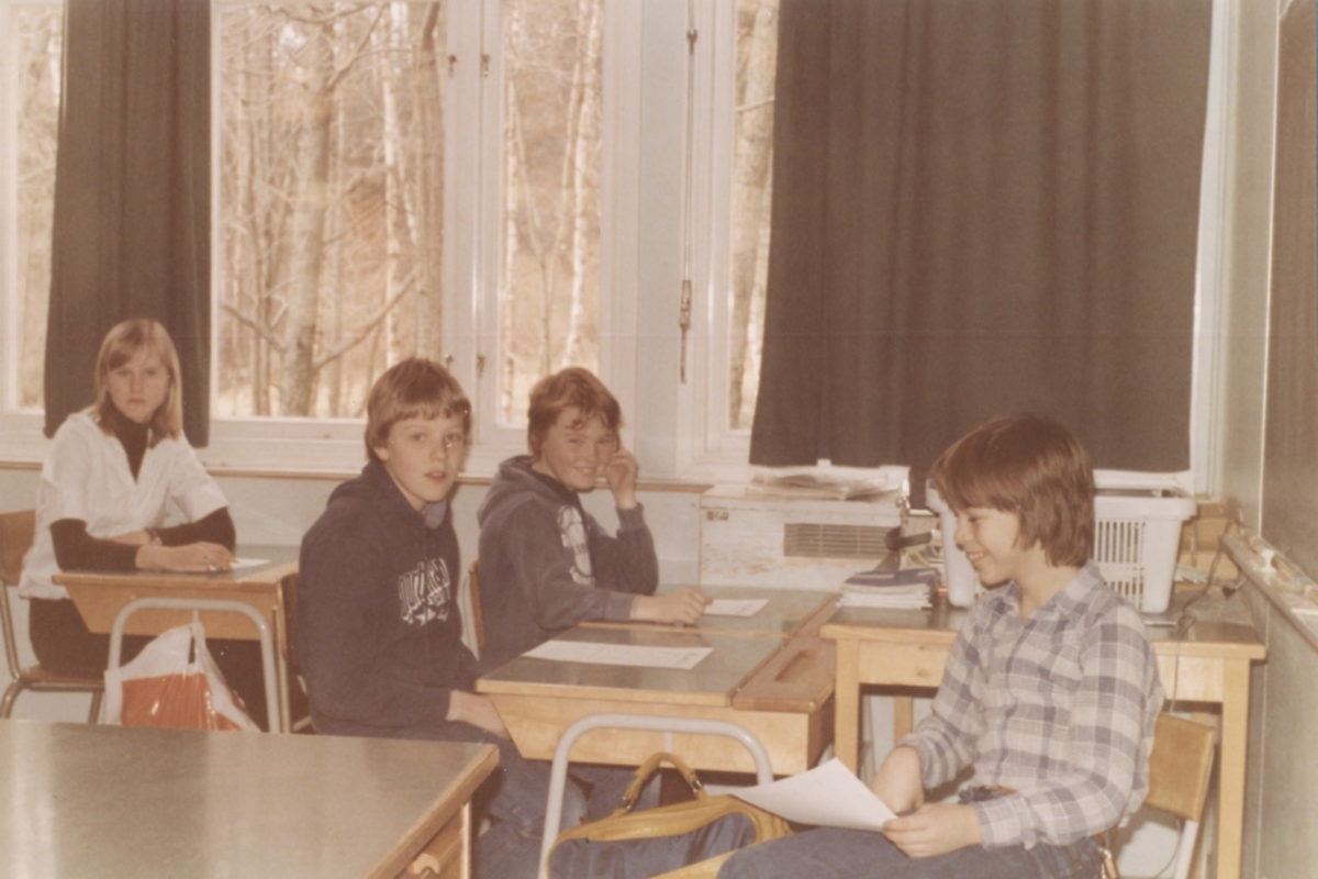 Fyra elever sitter i sina bänkar i ett klassrum, Brattåsskolan 1970- till 80-tal. Genom fönstren ses att det är vinter.