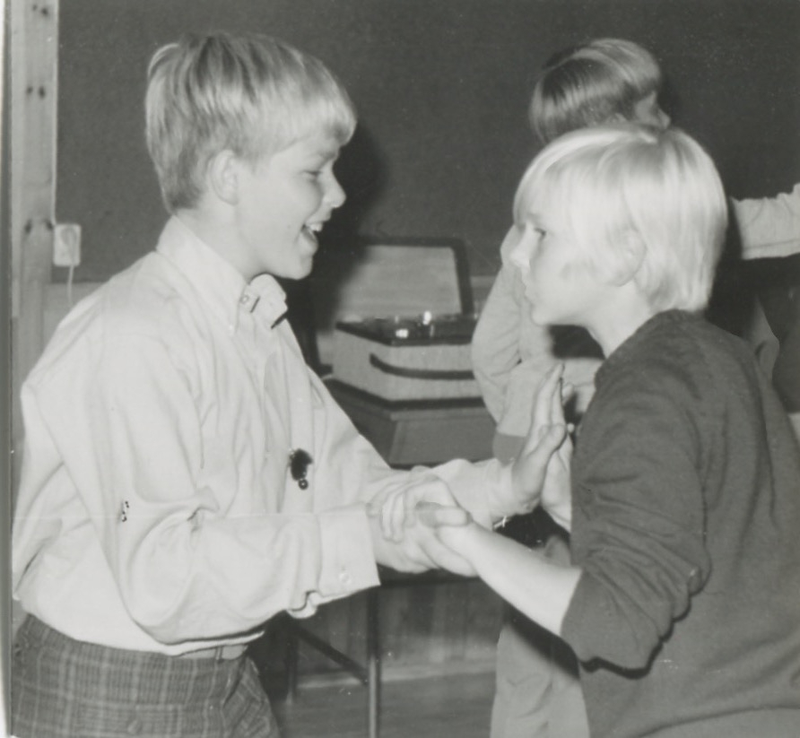 Elever från Brattåsskolans åk 6 är på lägerskola till Ransbergs Herrgård i Värmland cirka 1965 - 1975. Två elever dansar och har kul tillsammans under en kvällsaktivitet (fritid). I bakgrunden skymtar en rullbandspelare som står på ett bord.