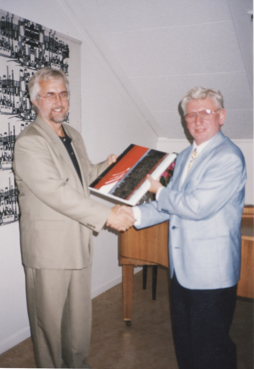 SVs årsmöte (Studieförbundet Vuxenskolan) i ateljé Takåsen på Brogatan 16 i Mölndal cirka 2000. Körledaren Jan Ivar Blixt (till vänster) tar emot ett kulturpris från ordförande Erling Alriksson.