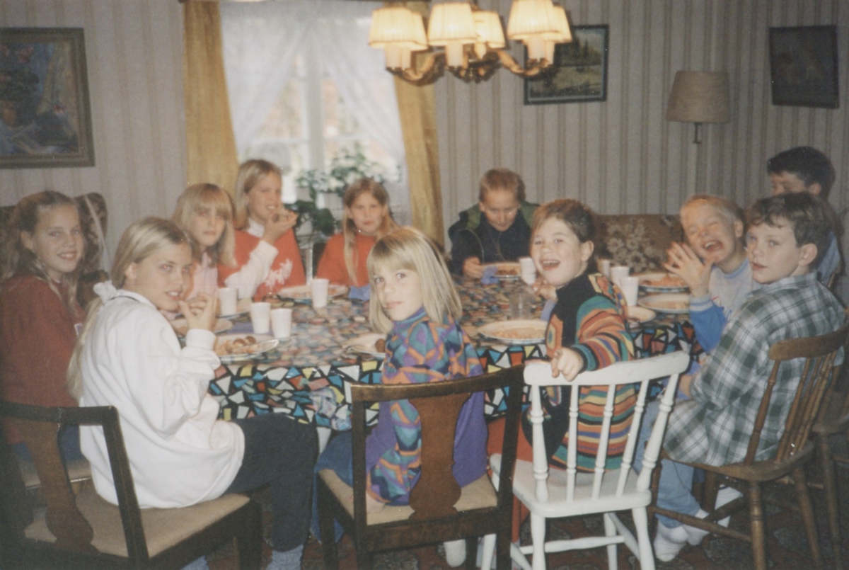 Lovverksamhet anordnad av SV (Studieförbundet Vuxenskolan Mölndal) i Vommedal Västergård "Hanses" cirka 2000. Elva barn sitter vid ett uppdukat matsalsbord med fika. Relaterade motiv: A4516 - A4526.