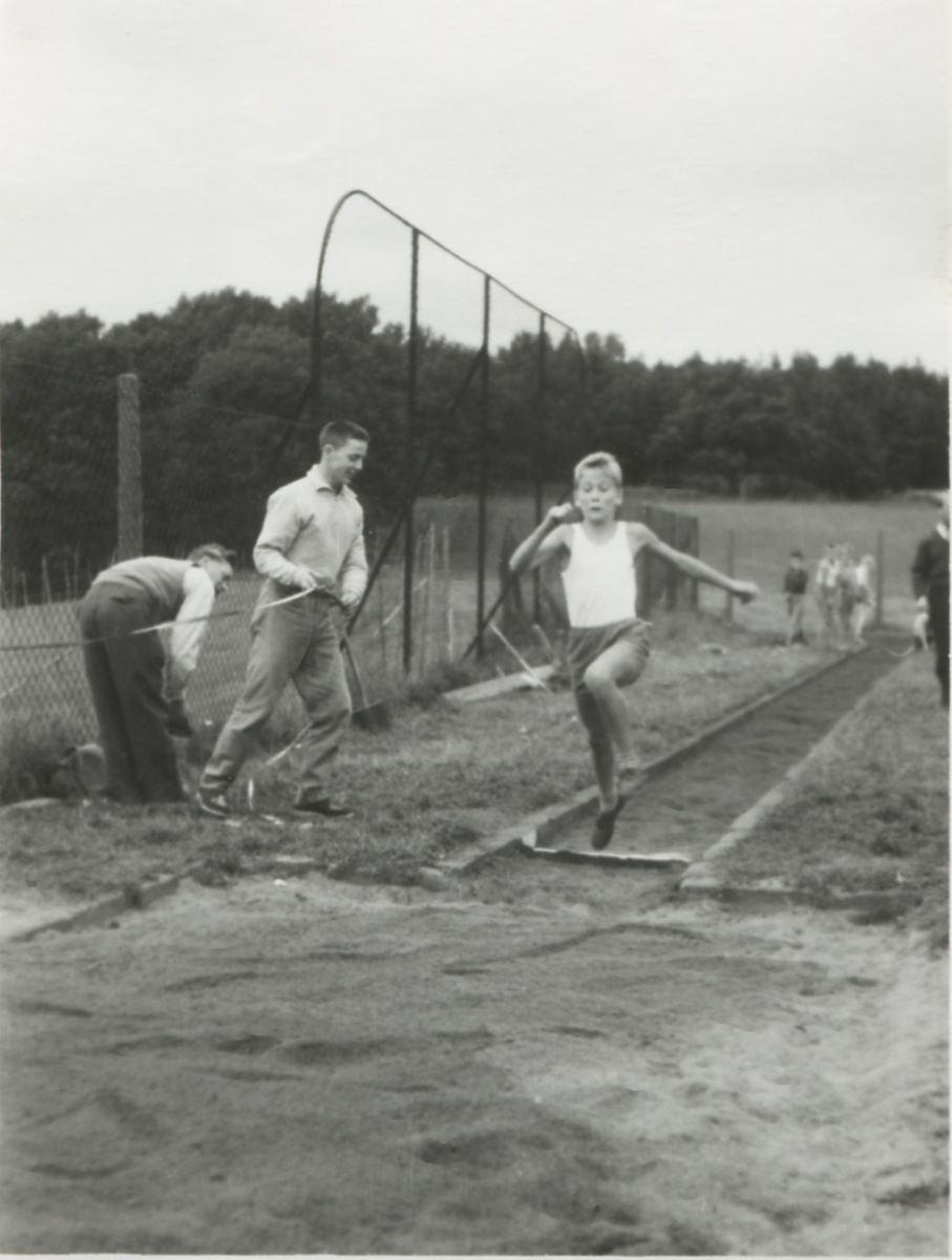 Elever från Kålleredskolan (senare Brattåsskolan) har idrottsdag på Stretereds idrottsplats 1950-tal. En elev hoppar längdhopp och till vänster står två elever för att mäta resultatet.