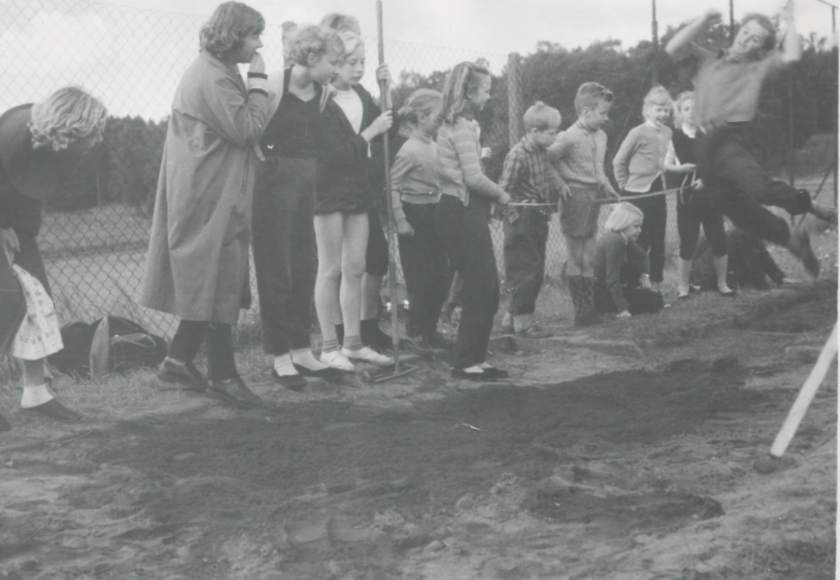 Kålleredskolans (nuvarande Brattåsskolan) elever har idrottsdag på Stretereds idrottsplats cirka 1960. Lärare och elever ser på när en kille hoppar längdhopp.