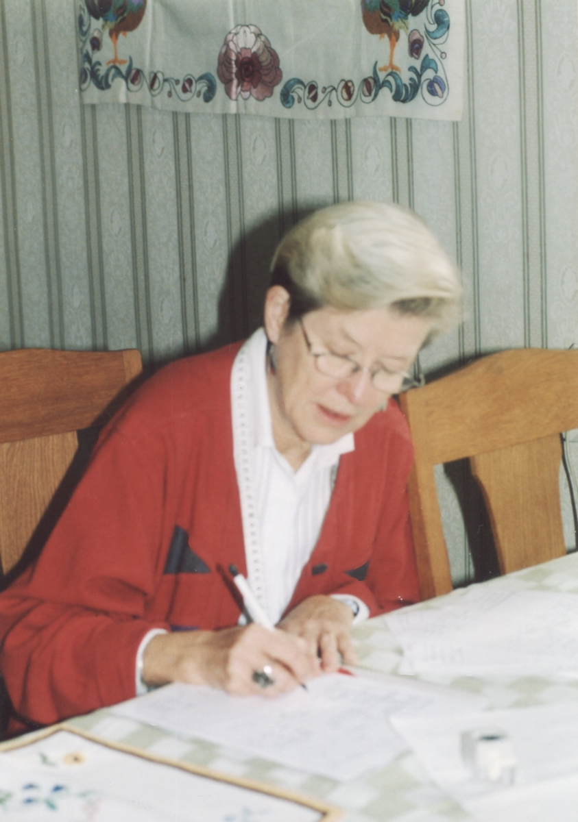 Ingrid Bergqvist från Mölndals Hembygdsförening, sitter vid ett bord och förbereder inför bonadsutställning i Vommedal Västergård "Hanses" cirka 2000. Anordnad av SV (Studieförbundet Vuxenskolan Mölndal), Mölndals Hemslöjdsförening och Kållereds Hembygdsförening. Relaterade motiv: A4531 - A4535.