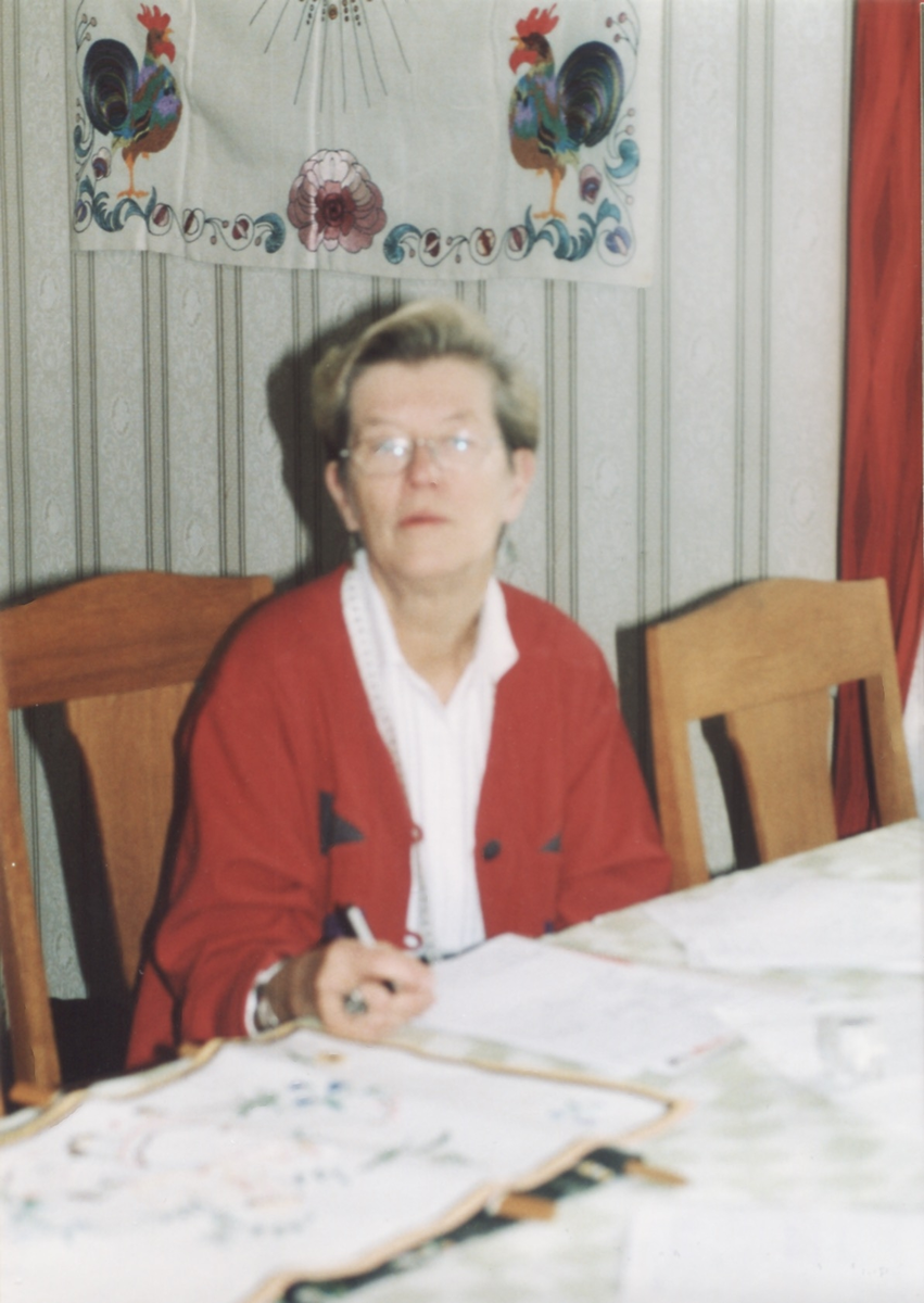 Ingrid Bergqvist från Mölndals Hembygdsförening, sitter vid ett bord och förbereder inför bonadsutställning i Vommedal Västergård "Hanses" cirka 2000. Anordnad av SV (Studieförbundet Vuxenskolan Mölndal), Mölndals Hemslöjdsförening och Kållereds Hembygdsförening. Relaterade motiv: A4531 - A4535.