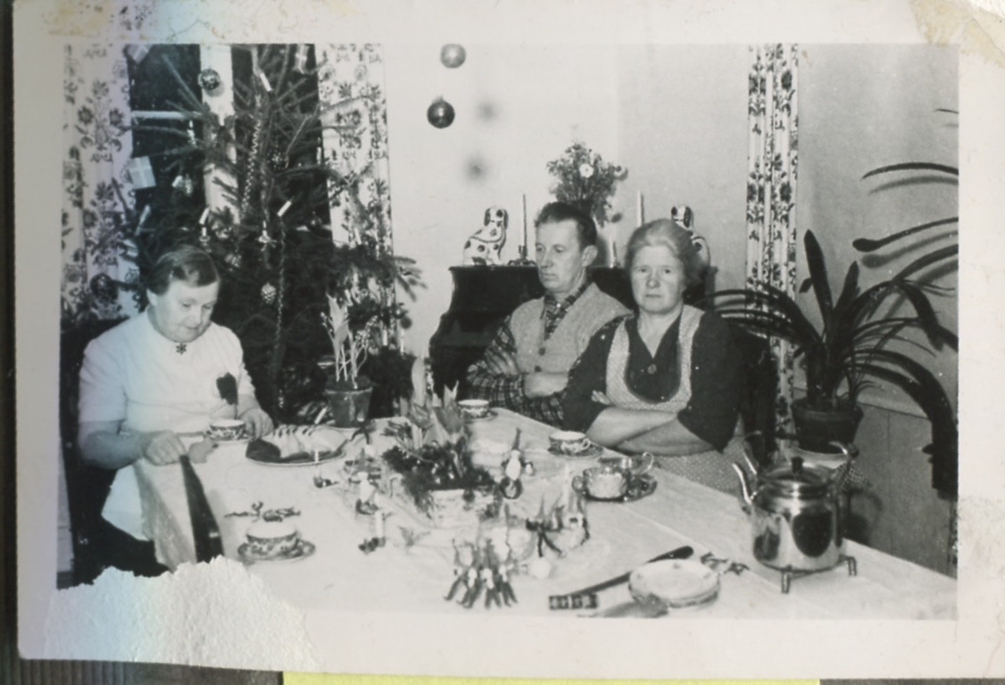 Julmiddag vid Heljered Västergård "Brors", okänt årtal. Från vänster: Svea Johansson (1892 - 1976), Bror (1902 - 1975) och makan Karin Johansson (1907 - 2003). Svea och Bror var syskon. Bror hade ett trädgårdsmästeri på gården.