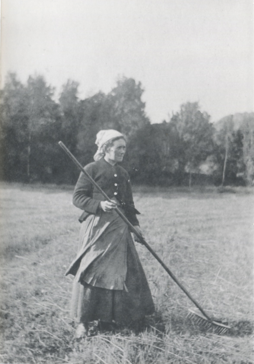 Alma Abrahamsson (1879 - 1957) står på ängen med en kratta i händerna, Vommedal Västergård Väster, okänt årtal. Hon var gift med Oskar Abrahamsson (1879 - 1954). Familjen arrenderade gården av Vallström.