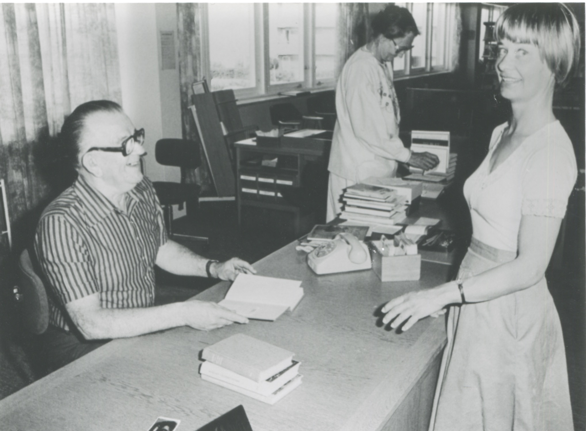 Till vänster bakom disken sitter föreståndare/bibliotikarie Ivar Andersson, lite längre bort står assistent/"sagoberätterska" Mary Ekman, Kållereds bibliotek 1970-tal. Framför disken står kunden Barbro Holm.