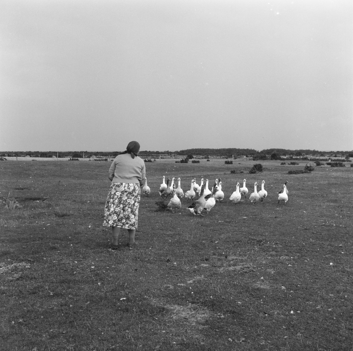 En kvinna lockar på en flock gäss som går på Ölands alvar.