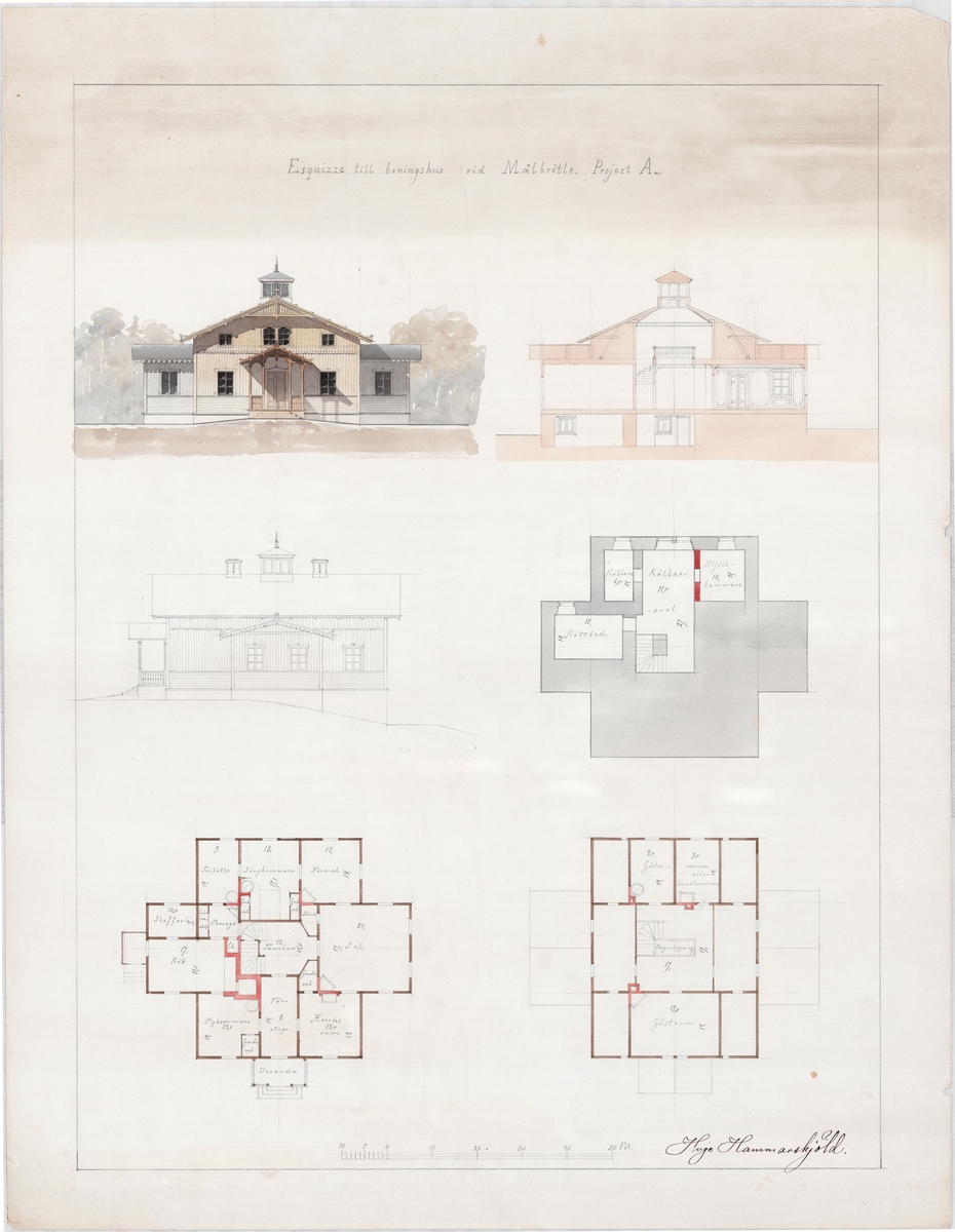 Kolorerad arkitektritning av Hugo Hammarskjöld. Projekt: Nytt bostadshus i två plan. Målbrötle. Utan årtal. Inga uppgifter om det kom att uppföras.