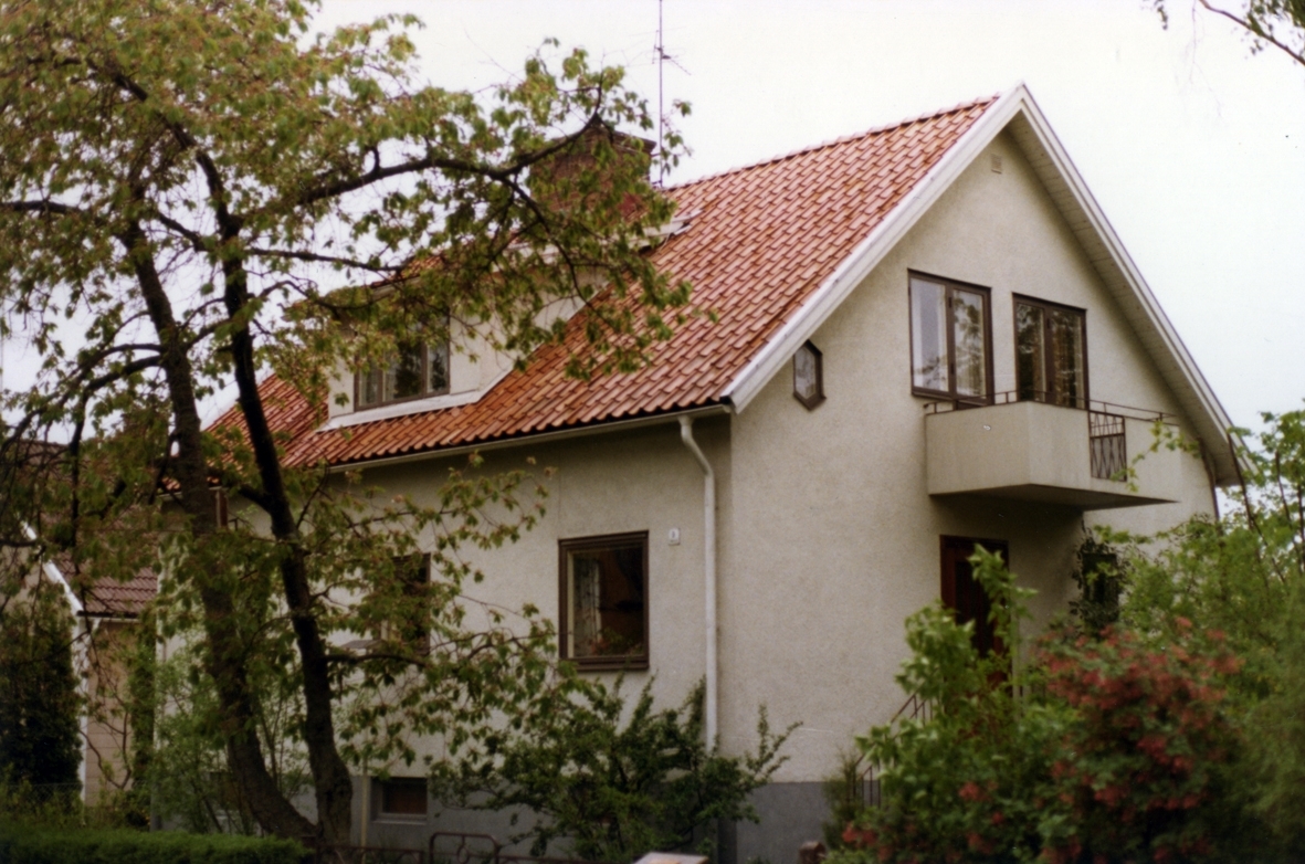 Bostadshus med putsad fasad, balkong och sadeltak på Merkuriusvägen 9. Byggåret var 1955. Ägare och byggmästare var Bertil Danielsson.