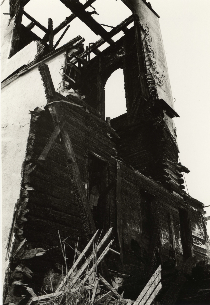 Titel: Hälleberga kyrka: Brandorsaken var ett elfel. Branden skedde 1976-10-18. Tornet under rivning.