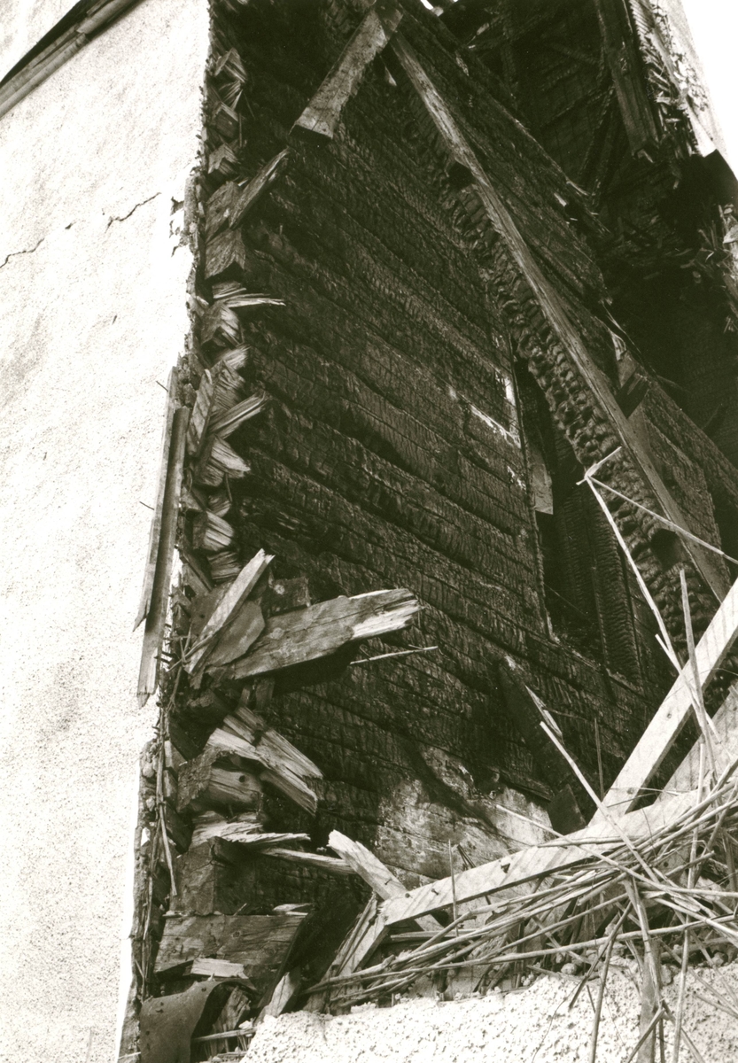 Hälleberga kyrka: Brandorsaken var ett elfel. Branden skedde 1976-10-18.