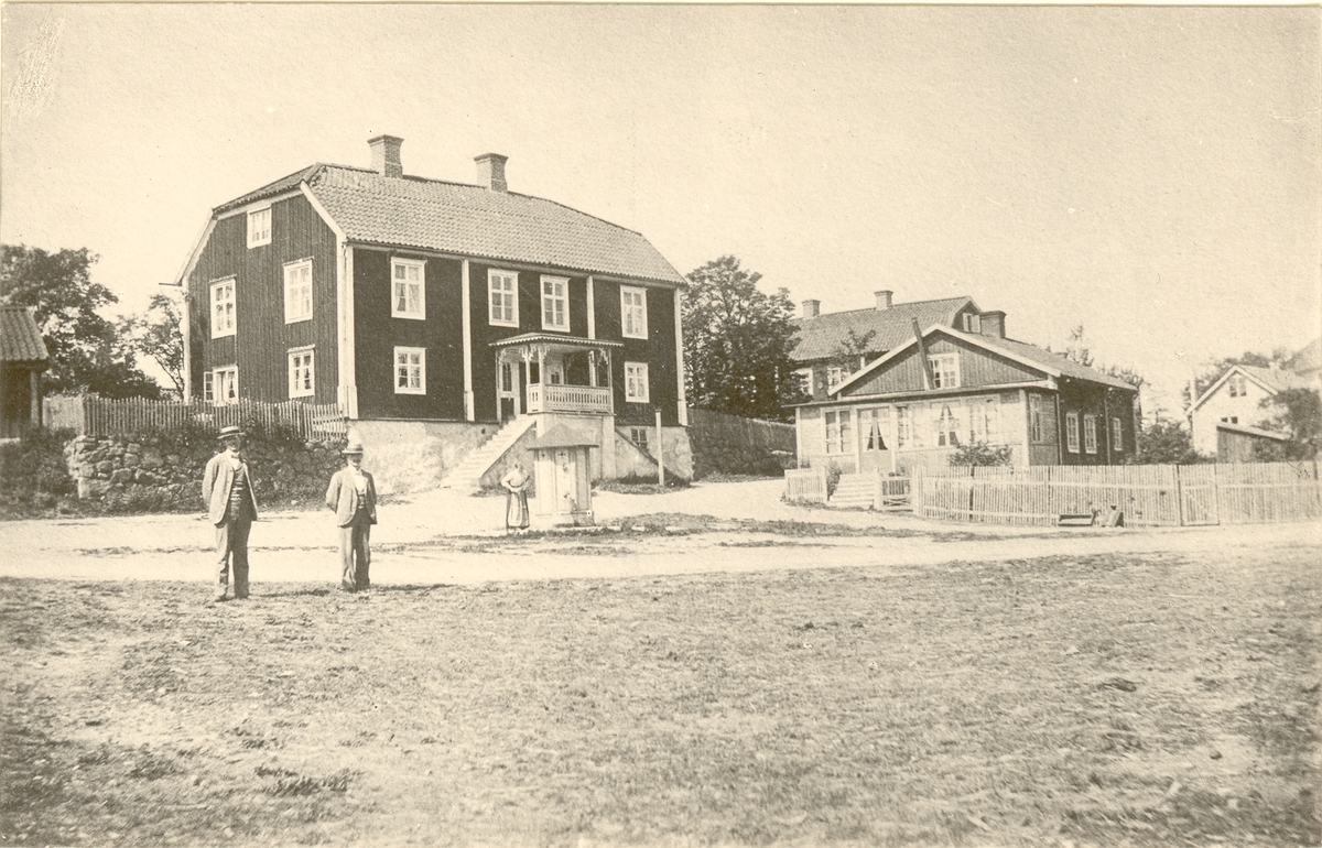 Torget med brunnen och en gammal byggnad, före dess ombyggnad av fasaderna. Målare Engströms hus.
