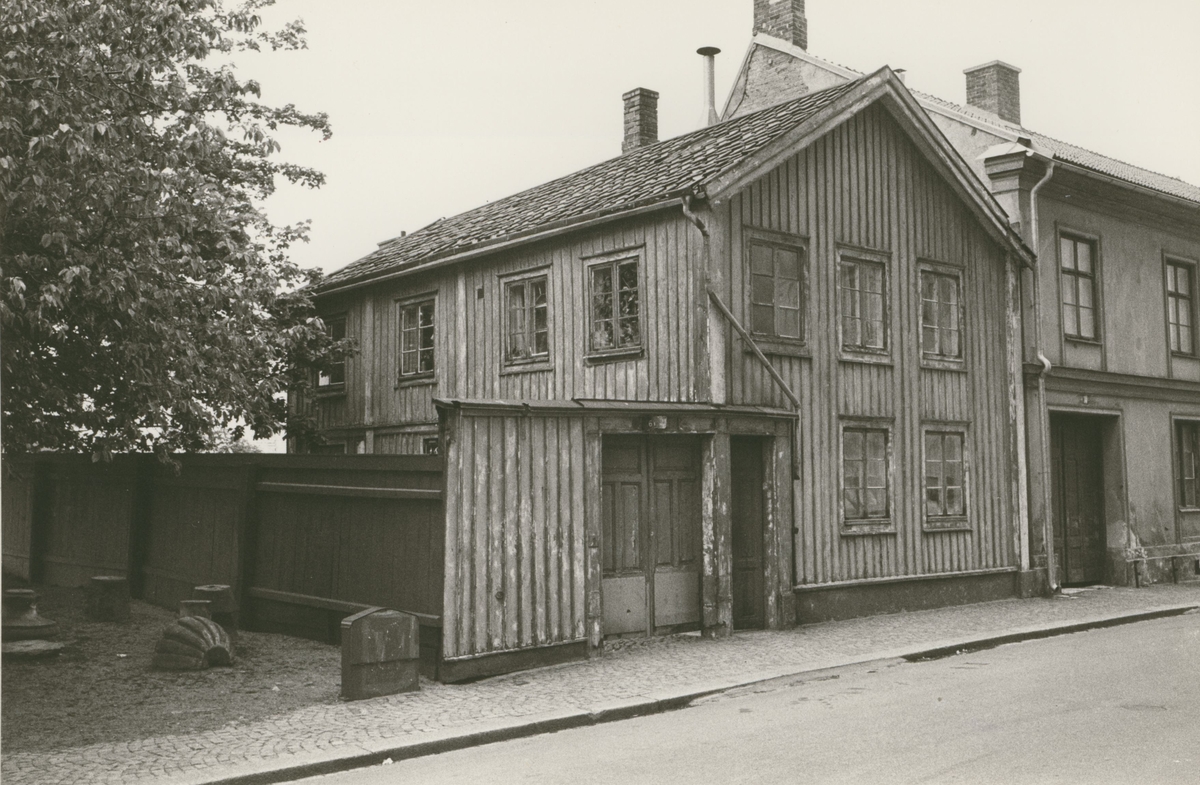 Bostadshus med träfasad mot Norra Långgatan. Bilderna är tagna inom ramen för Kalmar kommuns inventering av Kvarnholmens bebyggelse 1970-1971 och skänkta till länsmuseet.
