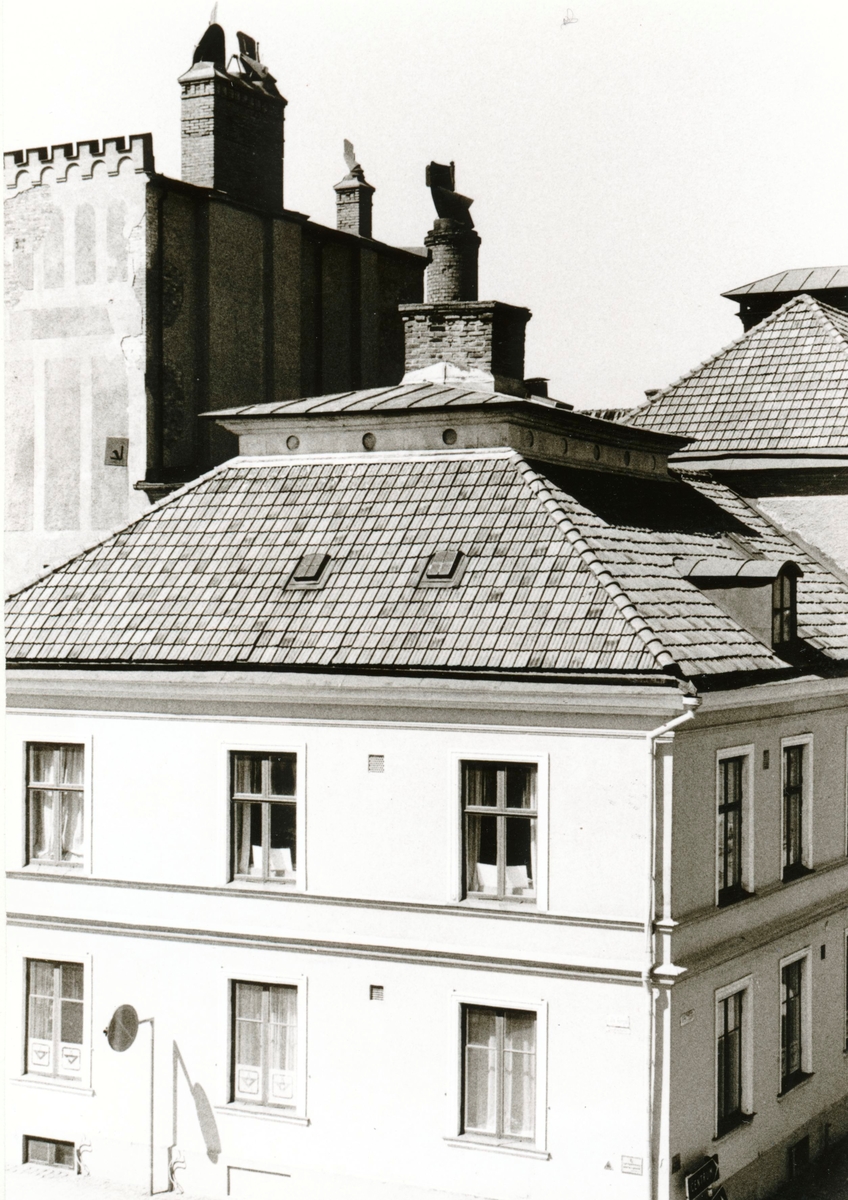 Motiv från Lilla torget. Ett bostadshus med säteritak.